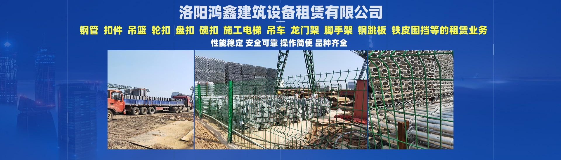 洛陽(yáng)鴻鑫建筑設(shè)備租賃有限公司專業(yè)從事:鋼管.扣件. 吊籃.輪扣.盤扣.碗扣.施工電梯.吊車.龍門架.腳手架,鋼跳板、鐵皮...